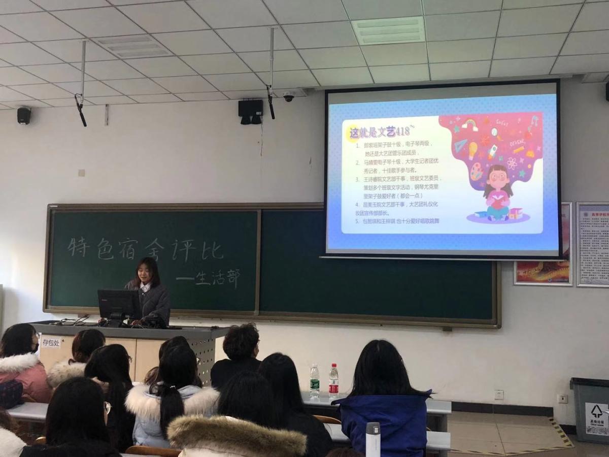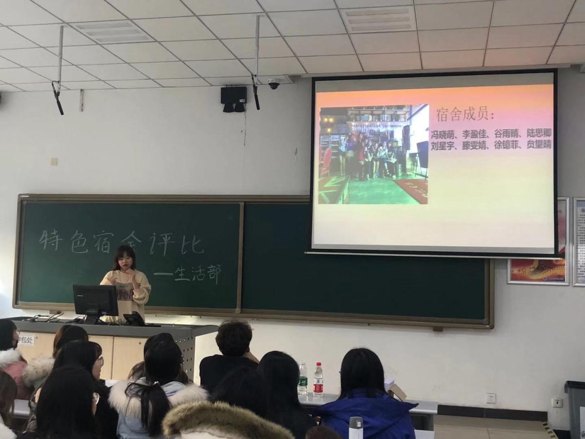 特色宿舍评比,参与的寝室准备好一份100字左右的自荐理由和一张宿舍合照,发送邮箱,初赛于11月24日—28日开通了投票通道,进行网络投票选举。各宿舍通过照片和文字展示了本宿舍文化氛围,使大家感受到了各个宿舍的特色与风采,通过此次网上投票选出了12个宿舍,12月4日,每个类别的宿舍中获票最高的两个宿舍,在人文类600做最后的展示和评选,最终从我院全体学生宿舍中考察筛选出“学霸宿舍” 1个、“爱心宿舍” 1个、“标兵宿舍” 1个、“健将宿舍” 1个、“文艺宿舍” 1个、“爱心宿舍” 1个。并进行了荣誉称号表彰。