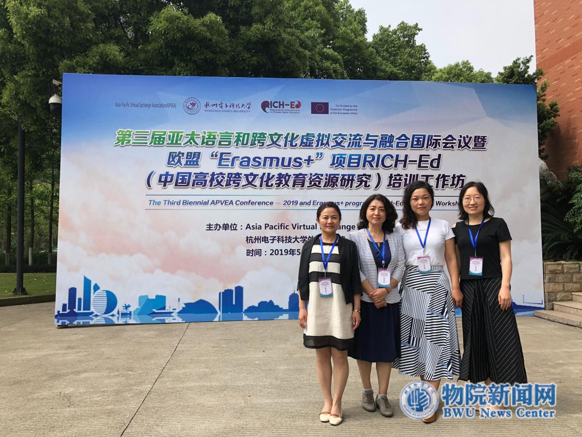 2019年5月17日—5月19日,由杭州电子科技大学外国语学院承办,亚太网络虚拟交流学会(APVEA)以及杭州电子科技大学共同主办的“第三届亚太语言和跨文化虚拟交流与融合国际会议暨欧盟“Erasmus+”项目RICH-ed(中国高校跨文化教育资源研究)培训工作坊”在杭州召开,草榴视频 教师李海英,孙静波,曲囡囡,万静静作为代表参加了会议。