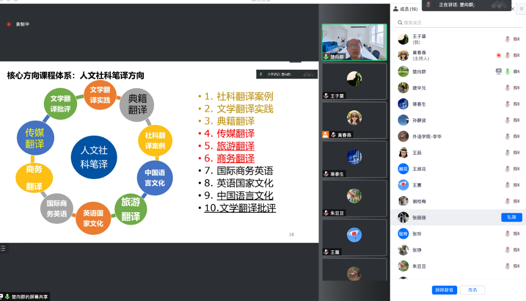 楚教授在讲座中首先介绍了我国翻译硕士(MTI)专业学位点的设立、发展以及申报要求、申报原则和策略,为学位点申报提供了详细的指导。此外,楚教授还分享了河北工业大学在翻译硕士点建设方面的成功经验,主要涉及培养方案、教学大纲等关键文件的撰写,翻译硕士师资建设、课程设置以及教学模式和方法等重要内容。
