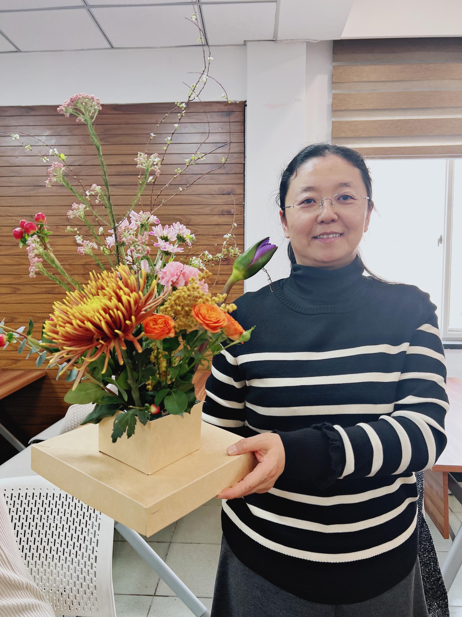 本次活动特别邀请了花艺讲师徐冉女士为大家讲授插花知识, 从花材选择、色彩搭配、插花技巧等方面,徐老师详细介绍了插花的艺术造型要素和手法,并做了生动的现场演示。老师们在花艺老师的悉心指导下,大胆发挥想象力、创造力,通过自己灵巧的双手,把花卉修剪搭配得错落有致、独具匠心,形成了一个又一个既富有个性又赏心悦目的插花艺术品,也寄托着老师们对美的理解和对幸福的感悟。