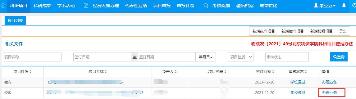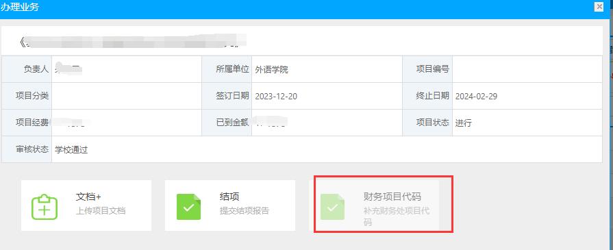 第四步:填写财务处项目代码。点击科研系统的科研项目,在横向课题右侧的办理业务里面填写财务项目代码,只是第一笔到账后填写,起到联通科研系统与财务系统的作用,第二笔到账跳过此环节直接完成经费卡入账;经科研处审核后,上传财务代码截图。