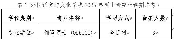 按照报考我院一志愿考生初试、复试情况,翻译硕士专业(055101)有调剂名额,欢迎有意愿的考生申报。具体调剂名额以全国硕士生招生复试调剂服务系统(以下简称“调剂系统”,网址://yz.chsi.com.cn/yztj/)公布为准。